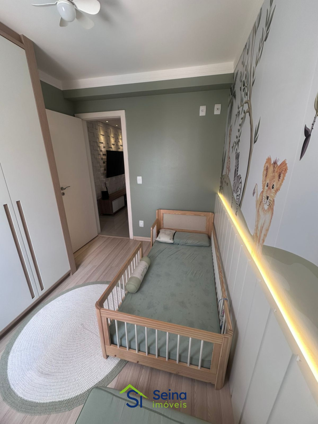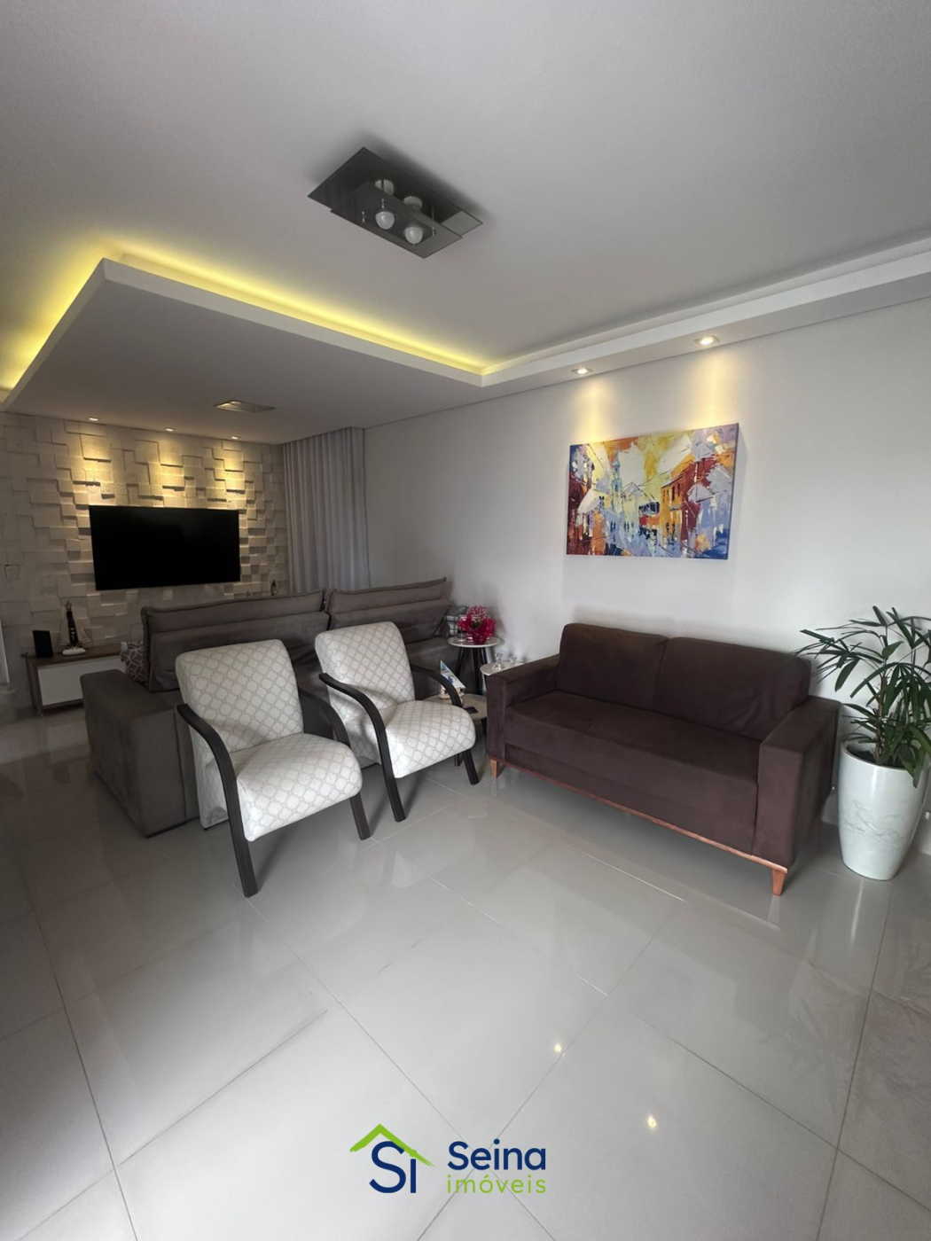 A área social se destaca pelo rebaixo de gesso com iluminação em LED, piso em porcelanato e integração com a varanda. A varanda gourmet com churrasqueira a carvão amplia o espaço de convivência e oferece acesso tanto pela sala quanto pela cozinha, além de fechamento em vidro, persianas e tela de proteção, garantindo conforto e funcionalidade no uso diário.