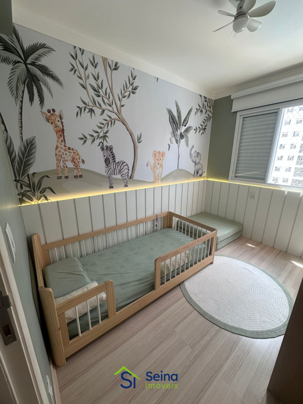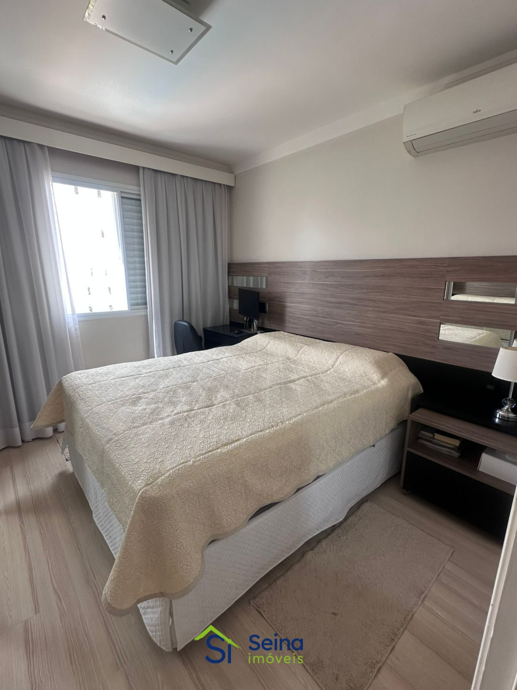 Na área íntima, os dormitórios contam com pisos laminados e armários planejados de ótima qualidade. O apartamento dispõe ainda de ar-condicionado instalado na sala e na suíte do casal, além de 2 banheiros, sendo um social e outro da suíte.