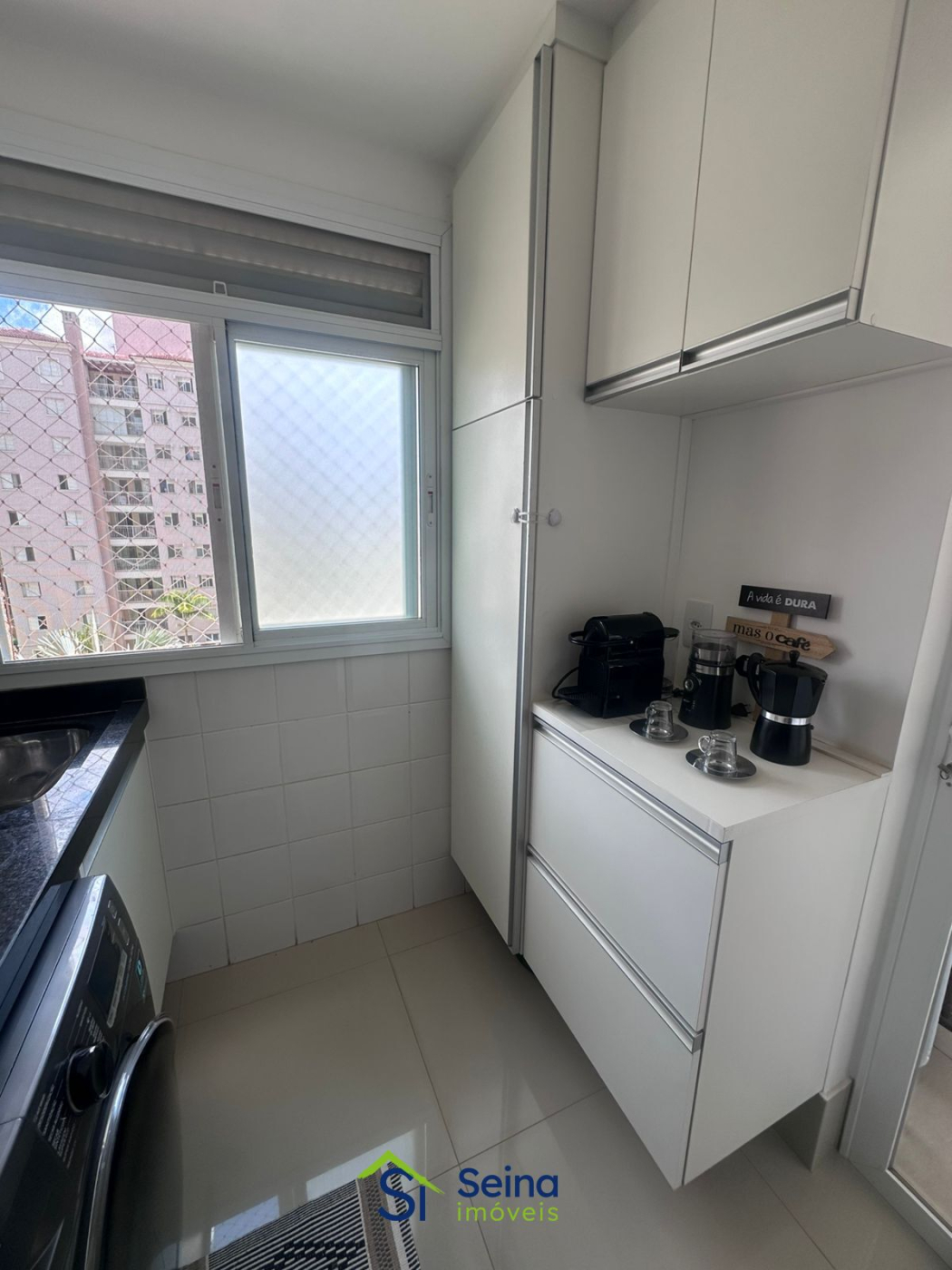 A cozinha segue o conceito americana, com bancada em pedra São Gabriel, integrada à sala e à varanda gourmet, favorecendo praticidade e integração. A lavanderia possui armários planejados e aquecedor de passagem instalado, item valorizado em apartamentos de revenda prontos para morar.