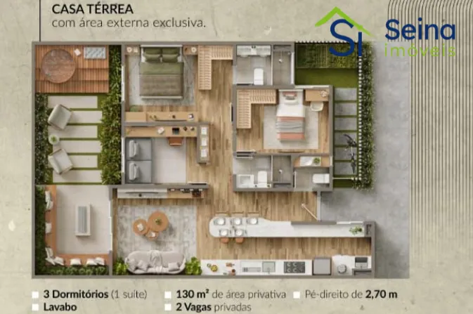 - 3 dormitórios sendo 1 suíte + lavabo e 2 vagas demarcadas