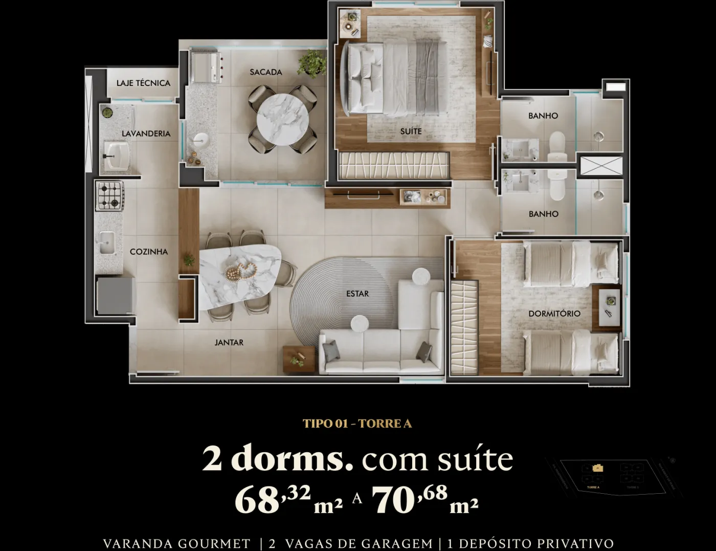 - - 68,32 m² a 70,68 m² com 2 dormitórios (1 suíte) – 76 unidades por torre, 2 elevadores