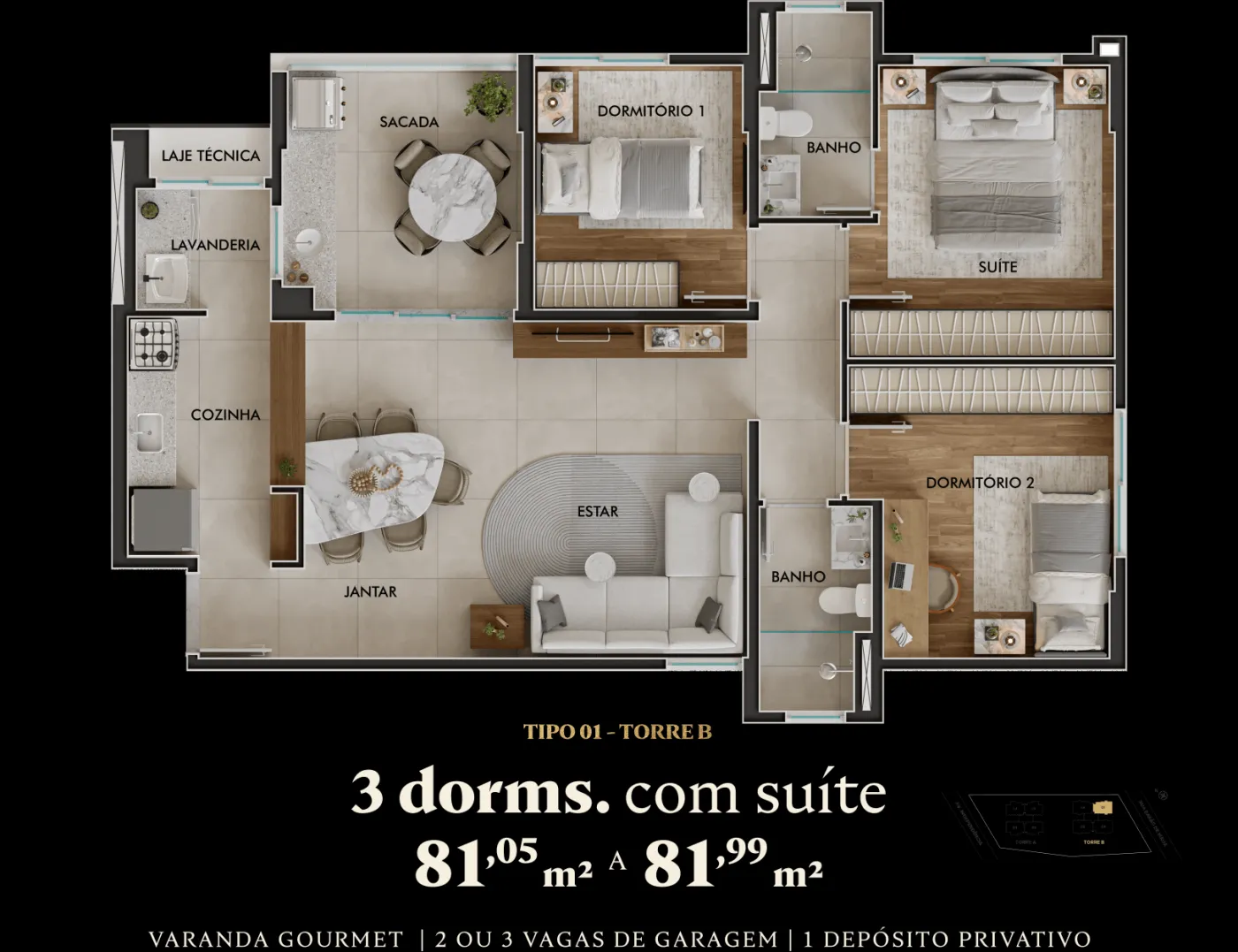 - 81,05 m² a 81,99 m² com 3 dormitórios (1 suíte) – 76 unidades por torre, 2 elevadores - - Total de 152 unidades residenciais.